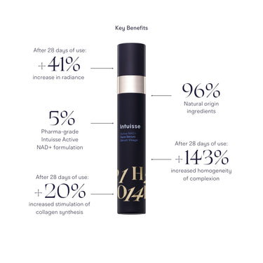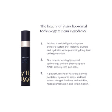 Intuisse's NAD+ skincare helps replenishes these levels directly within skin cells, boosting their ability to renew, repairs and defect against damage. For mature skin, this means better elasticity, reduction of fine lines and wrinkles, improved texture and radiance, and long-term resilience.